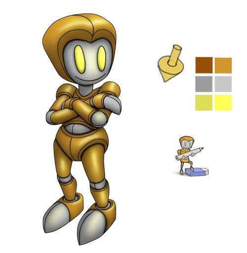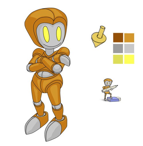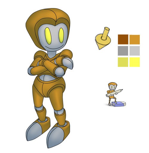 Il est nécessaire de choisir la direction de la lumière principale et de la représenter sur un calque à part. Préparez aussi toutes les références photos que vous avez, si vous en avez, ainsi que votre palette de couleur. Mettez le tout sur le même calque, c’est plus pratique. Ici, j’ai représenté mon ami Océ accompagné d’une flèche en trois dimensions qui indique la direction de la lumière, ainsi que d’une palette approximative et d’une référence sur son design de base .(J’en ai profité pour l’améliorer tant qu’à faire ^^).