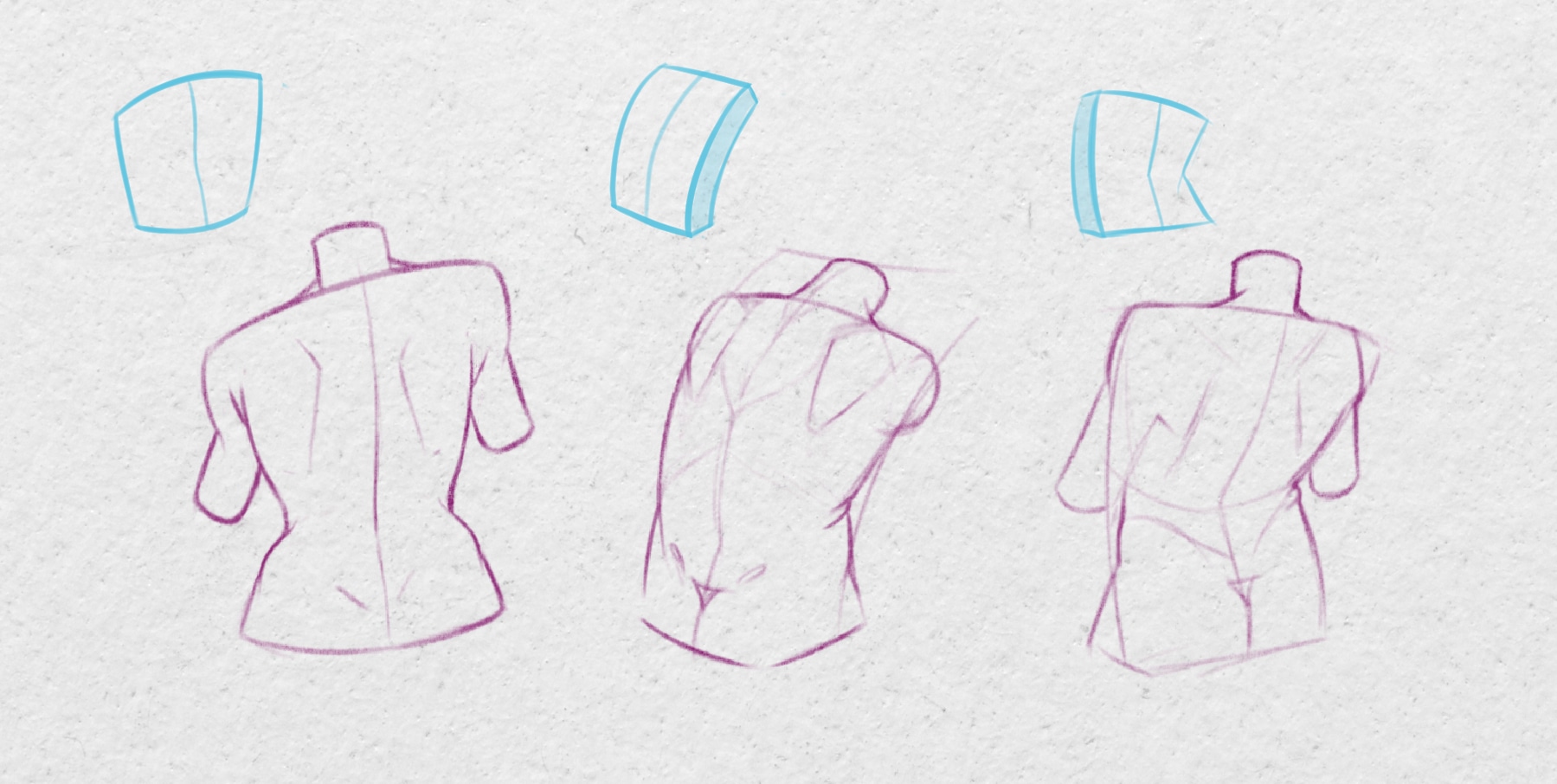 Une fois la structure du dos intégrée, il devient nettement plus facile de le dessiner sous tous les angles de vue en utilisant des volumes simples que l’on peut tordre à volonté.
