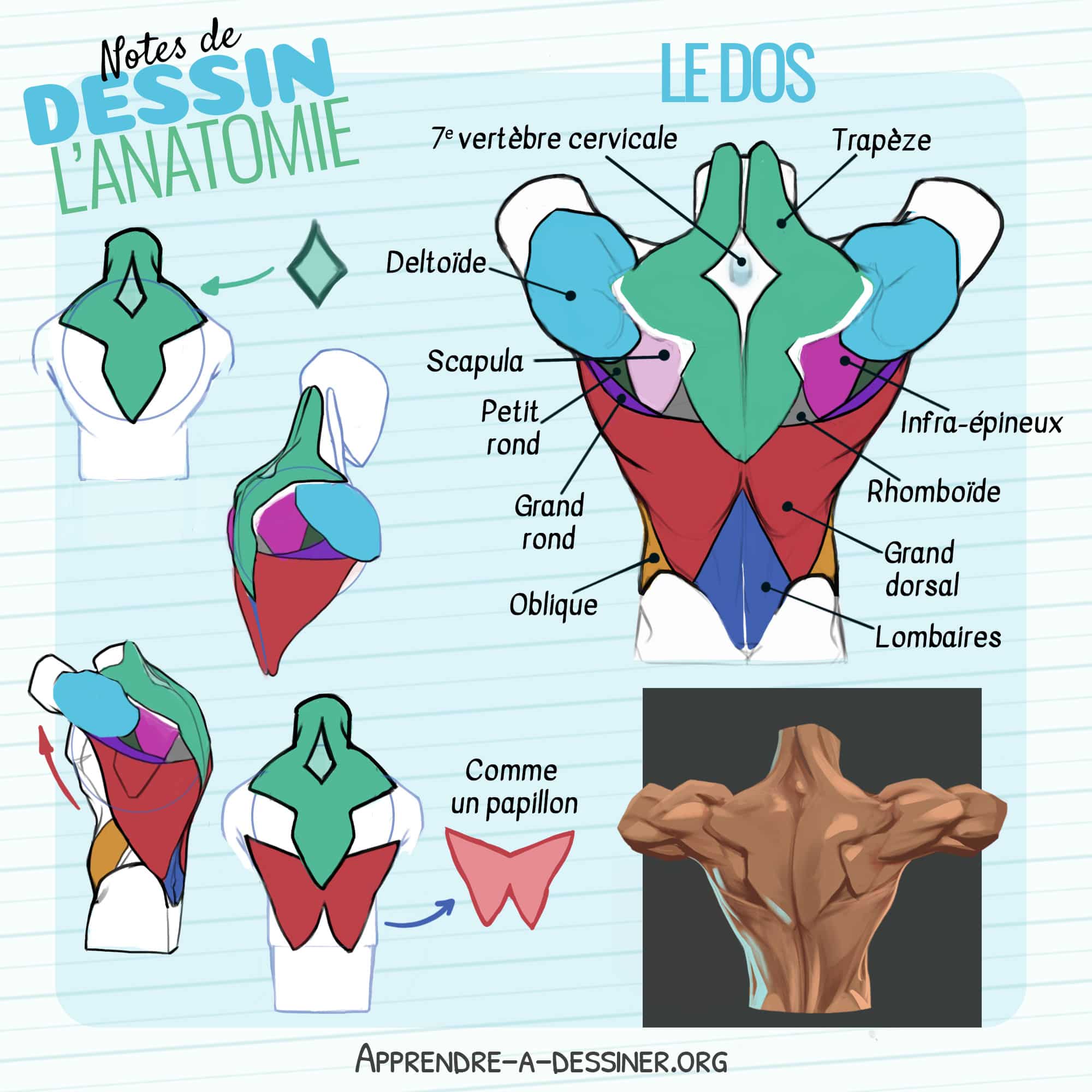 Voici les principaux muscles et os du dos visibles à prendre en compte en dessin :