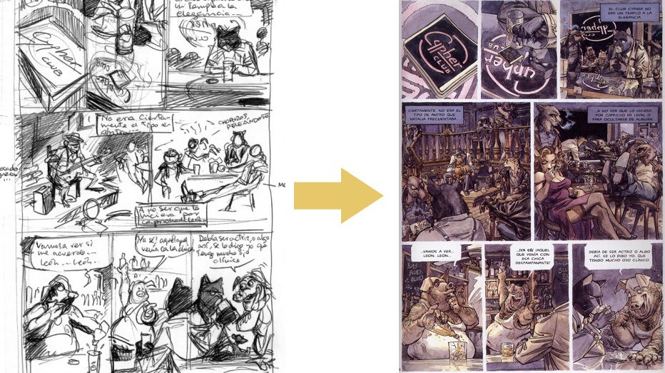 On peut voir sur cet exemple que le storyboard découpe l’action rapidement pour aller à l’essentiel. Bien sûr, il sera moins précis que la planche de bd en elle-même, mais il donne un aperçu rapide du lieu, de l’ambiance, des personnages et de l’action. Passer à la planche finale sans avoir pris le temps de découper la scène de cette façon serait une terrible erreur. Le storyboard n’est pas une perte de temps, c’est même plutôt le contraire : c’est un gain de temps considérable même si on a toujours tendance à vouloir dessiner la planche finalisée directement. Je me souviens même que Juanjo Guarnido, dessinateur de Blacksad, avait révélé qu’il n’aimait pas spécialement le stade du storyboard mais que cela restait tout de même une étape indispensable dans la mise en œuvre d’une bande dessinée.