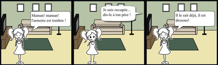 Jennifer, une petite fille blonde vêtue d’une robe interpelle sa mère avec inquiétude: « maman ! maman ! l’armoire est tombée ! ».