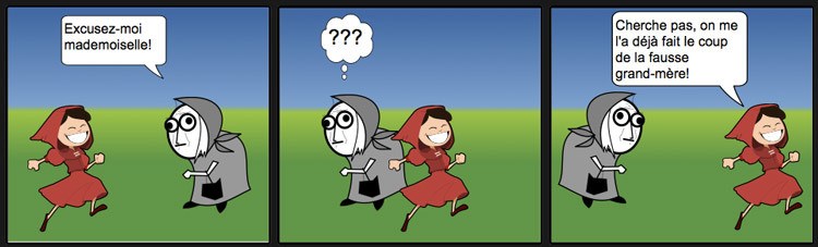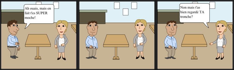 Bon, cet outil est en anglais, mais pas besoin de comprendre l’anglais pour faire des glissés-déposés. J’ai passé moins d’une minute sur chaque case. Quel gain de temps! Plus besoin d’être un artiste pour réaliser ses propres bandes dessinées de nos jours, enfin, j’exagère un peu, mais je suis sûr qu’avec le temps les outils dans ce genre seront de plus en plus nombreux, et c’est tant mieux pour ceux qui ne savent pas dessiner, je parle spécialement pour les scénaristes