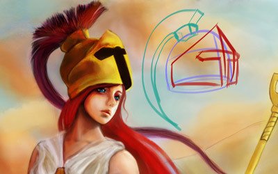- Choisis une ligne de vision. Je sais que généralement, certains dessinateurs amateurs commencent par dessiner le personnage, puis pensent après coup à dessiner un décor. Malheureusement, ce n’est pas ce qu’il y a de mieux à faire pour réaliser une image cohérente, bien qu’il ne soit pas impossible de procéder dans ce sens (dans la mesure où l’on est assez expérimenté). Pour connaître le niveau de la ligne de vision, il faut se mettre à la place du spectateur et se poser la question suivante : « quelle est la taille du spectateur, par rapport aux éléments ? ». Cela revient à se demander « quelle est la hauteur de la ligne de vision par rapport au cadre de l’image? ». À vue de nez, je dirais que notre œil se situe à peu près au niveau des cuisses d’Athéna, ce qui fait que l’on voit son thorax et son visage (qui lui-même est incliné et amplifie l’effet) en légère contre-plongée.