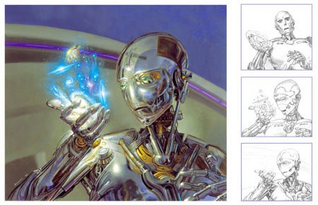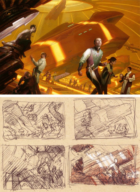 Bien sûr, nul besoin de faire une vignette pour des croquis au trait qui n’ont pas ce besoin compositionnel, pourtant il s’avère que même si vous allez dessiner sans cadre précis, la miniature pourra toujours vous servir, ne serait-ce que pour organiser le rendu des ombres, pour tester des effets graphiques ou pour expérimenter plusieurs designs d’un même sujet. La vignette permet de visualiser en quelques traits et quelques valeurs :
