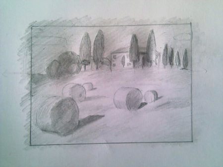 Esquisse des formes simples. J’en ai profité pour recomposer et dégager un peu l’extrémité gauche de la maison: en tant que créatif vous avez une infinie liberté. Ne vous contentez pas toujours de ce que vous voyez, poussez les choses vers ce que vous VOULEZ voir.