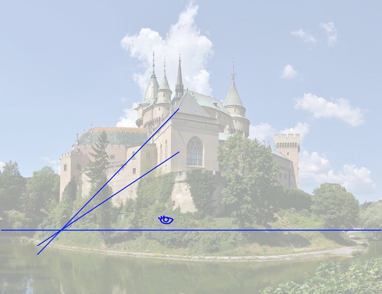 Je trouve ma ligne de vision en m’aidant des lignes de fuite que j’ai trouvées sur un des objets. Plus ces lignes de fuite sont écartées et mieux c’est. Dans ce cas, et pour des raisons de démonstration, j’ai choisi deux fuyantes qui se coupaient dans le champ de vision. À partir de cette intersection, je trace une horizontale, et j’obtiens ma ligne de vision. Attention: c’est parce que je sais que le bâtiment est droit et ancré au sol que je peux en déduire la ligne de vision. Si l’objet était bancal, ou que l’observateur n’avait pas le regard horizontal, la ligne de vision n’aurait pas été la même que l’horizon de l’objet.