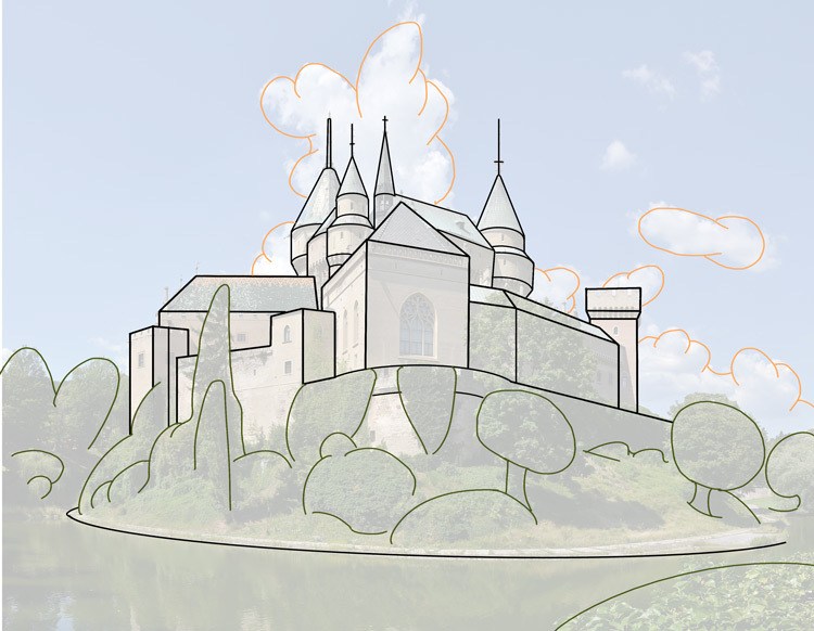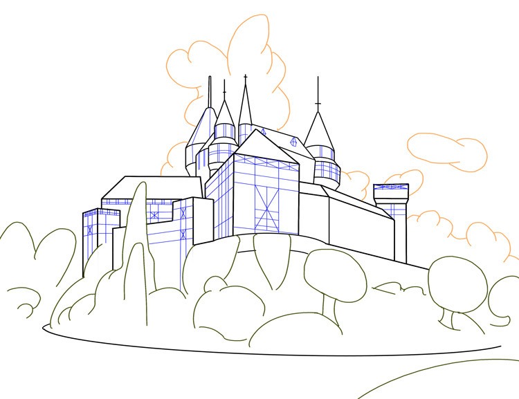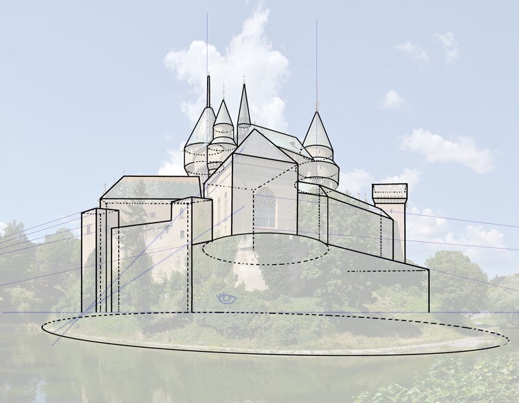 2e étape: je simplifie les formes par des cylindres et des parallélépipèdes. Pour cette scène c’est assez facile, car toutes les fuyantes finissent sur la ligne de vision. C’est grâce à cette simplification qu’on peut se rendre compte que le château n’est pas si difficile à comprendre. Je me force à représenter les parties des formes qu’on ne voit pas.