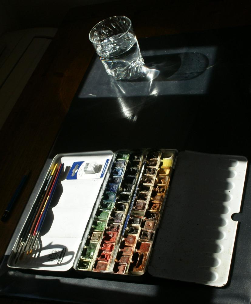 Si je dois parler de ma technique d’aquarelle : elle est totalement antinomique. Je m’explique: normalement, pour démarrer une aquarelle, on mouille sa feuille. Eh bien je n’en fais rien. Après avoir transposé mon dessin sur mon support (papier Canson Montval 300grm avec peu de grain et en général format raisin) je prends de tout petits pinceaux en martre de préférence pour donner du détail. Mon aquarelle est sous forme de godets aux pigments assez vifs (Schmincke de préférence sinon Windsor et Newton) que j’utilise un peu comme de la gouache avec relativement peu d’eau.