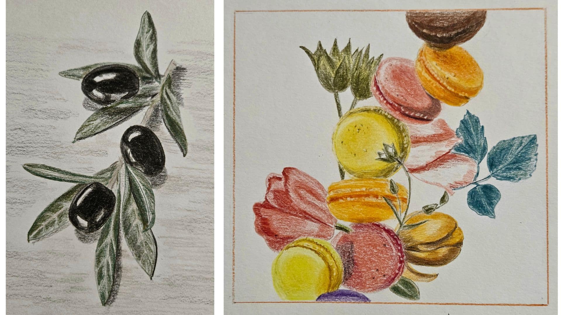 Très beau dessin, j'ai une préférence pour les olives, bien que les macarons soient très tentants ! Hmmmmmmm
