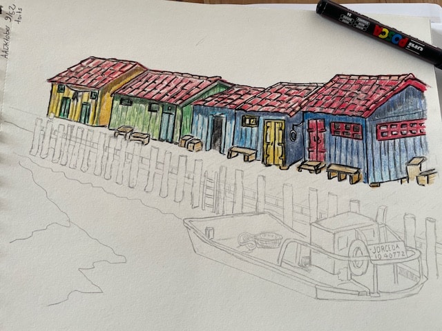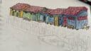 et là, à part laisser ton crayon travailler tout seul sur ta feuille … Tes petits cabanons sont très jolis, et les bancs devant invitent à prendre place devant la mer, ce que j'adore !