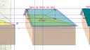Depuis ce milieu tu traces une ligne horizontale sur le plancher du grenier, elle coupe la façade avant en un point qui est alors le milieu de celle ci, cette même ligne horizontale coupe également la façade arrière en son milieu.