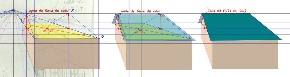 Maintenant tu disposes de 6 points correctement placés pour définir ton toit, il suffit de les joindre pour obtenir toutes les lignes de ton toit que tu vois en transparence.