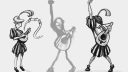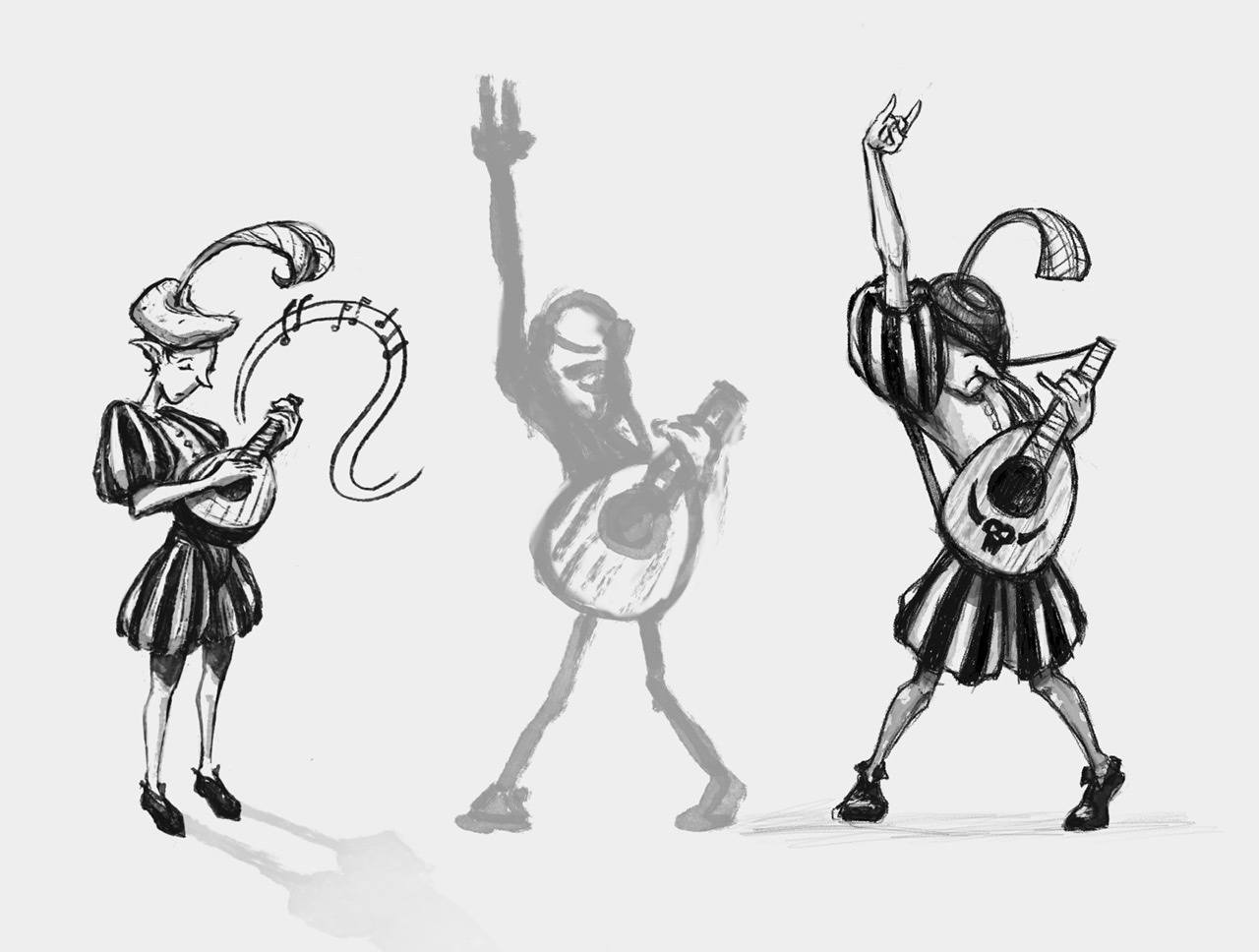 J'ai trouvé les instruments de musique, comme toi : le luth et aussi le serpent. Comme d'habitude tu as de bonnes idées et la position choisie avec son luth est parlante et dynamique. Tu devrais revoir la rambarde sur laquelle il danse, les trois traits, qui représentent probablement une moulure, m'ont fait penser à du contreplaqué. Et aussi j'ai appris que la caractéristique des vêtements renaissance est le crevé, c'est à dire les entailles faites dans le vêtement du dessus, pour laisser voir la chemise, qui est parait il une nouveauté à l'époque. Donc pour la montrer on fait des entailles dans les manches du pourpoint. Essaie de représenter cela sur ton personnage, tu as le style et la technique qu'il faut pour représenter parfaitement cela, et cela apporterait du dynamisme à la manche qui fait un peu plate.