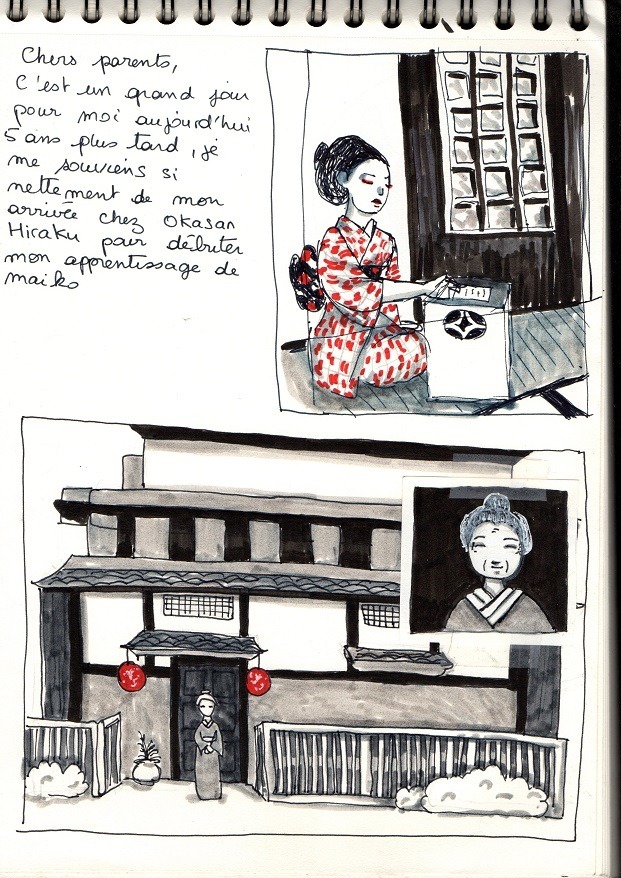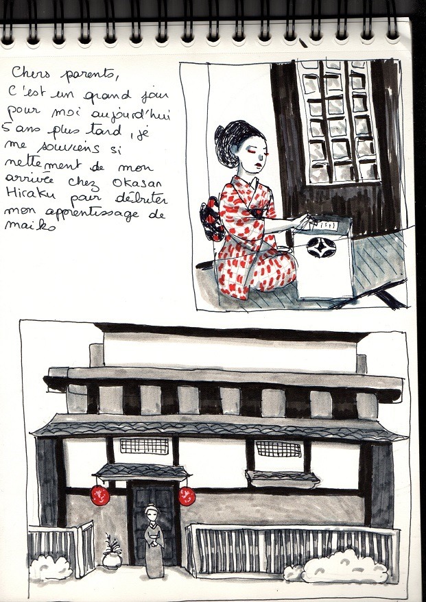 Chers parents, c’est un grand jour pour moi aujourd’hui. Après 5 ans, je me souviens très nettement de mon arrivée chez Okasan Hiraku pour débuter mon apprentissage de maiko.