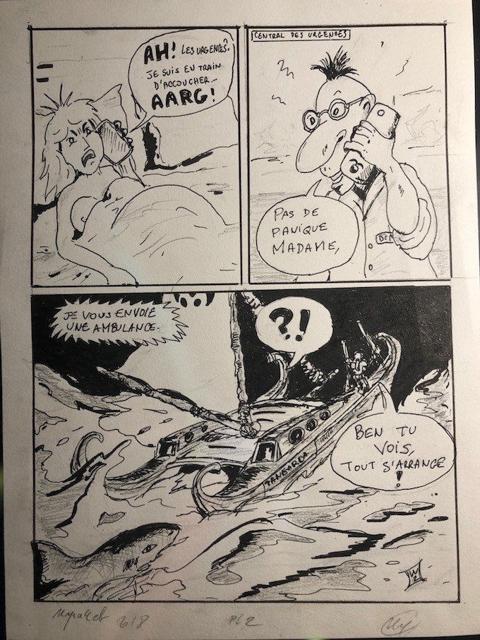 @Igricheff@Sophie36 (manga-ya) Désolé le suspens va être assez court ! sans déflorer le final( volontairement absurde et sans aucune liaison avec la malheureuse actualité), j'ai fait une mise ne page en deux fois trois cases, inversées( cad grosse case, moyenne, moyenne, moyenne, moyenne, grosse case), je viens d'encrer la dernière case ( la grosse).