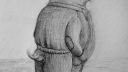 Aujourd'hui, voilà tout de même un petit truc vite fait accidentel : trainait sur mon plan de travail une vignette écartée d'un paysage , la feuille était flippée à 90° et j'ai découvert un visage (celui d'un vieil homme avec cheveux longs, barbe et chapeau). Je l'ai donc dessiné comme il m'était apparu. N'y cherchez pas proportions etc… il n'y en a aucune, c'est du brut , du lâcher-prise !