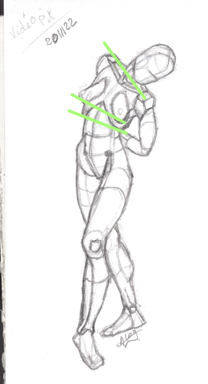 J'aurais juste une remarque sur le thorax. Même si les épaules peuvent être un peu desaxées (si on en lève une par exemple), la plupart du temps elles sont parallèles au reste du thorax. Je me suis permis d'ajouter des lignes pour expliquer. Les lignes vertes devraient être parallèles (voire convergentes car perspective), mais peu de chance qu'elles soient divergentes. Je pense que la pointe des côtes à droite (sur le dessin) n'est pas assez basse.Bon courage pour la suite, je pense que tu es bien parti.