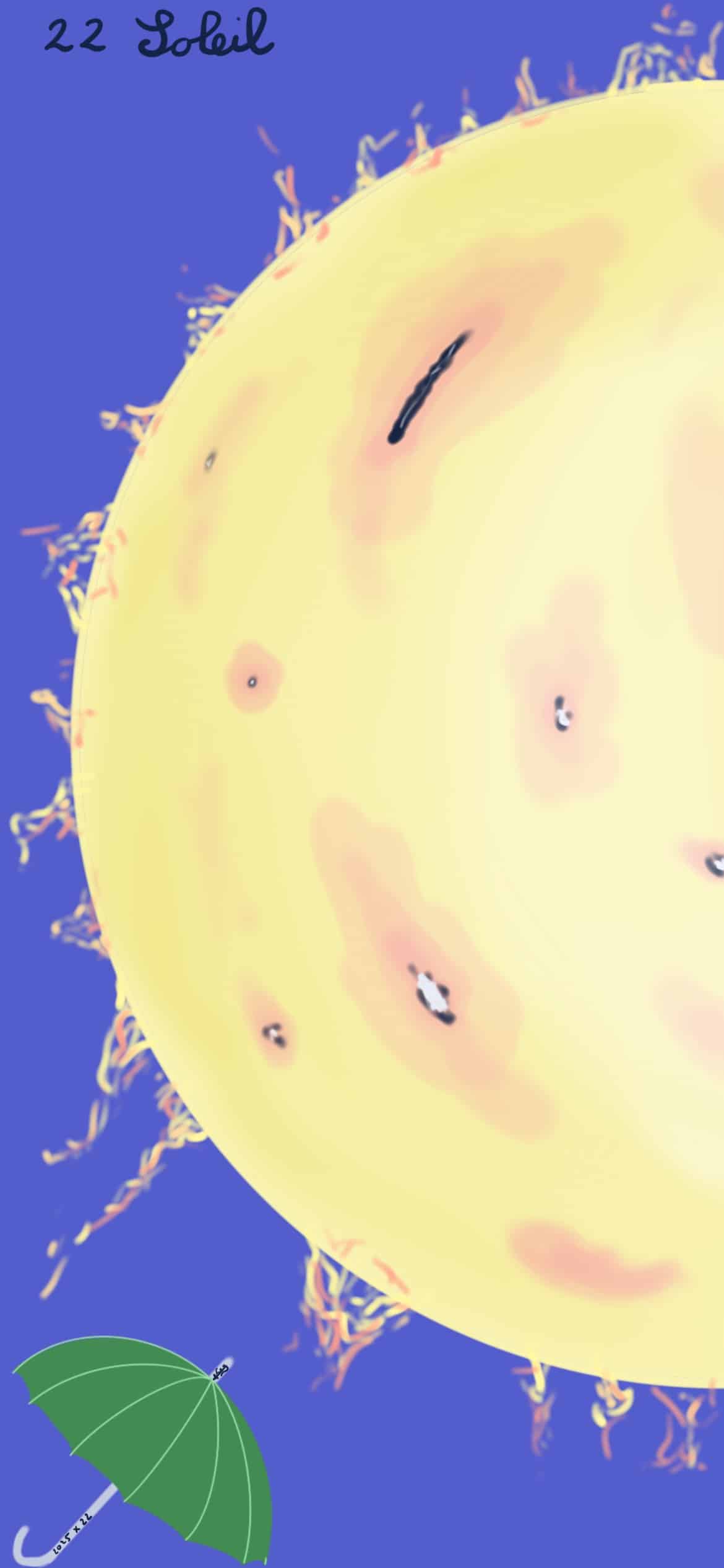 Ici, il est plutôt bien caché. Je l’ai fait sous Procréâtes de mémoire, d’après un certain nombre de photos astro du soleil. Mes taches ne rendent pas comme je le voulais mais je suis quand même contente du résultat.