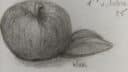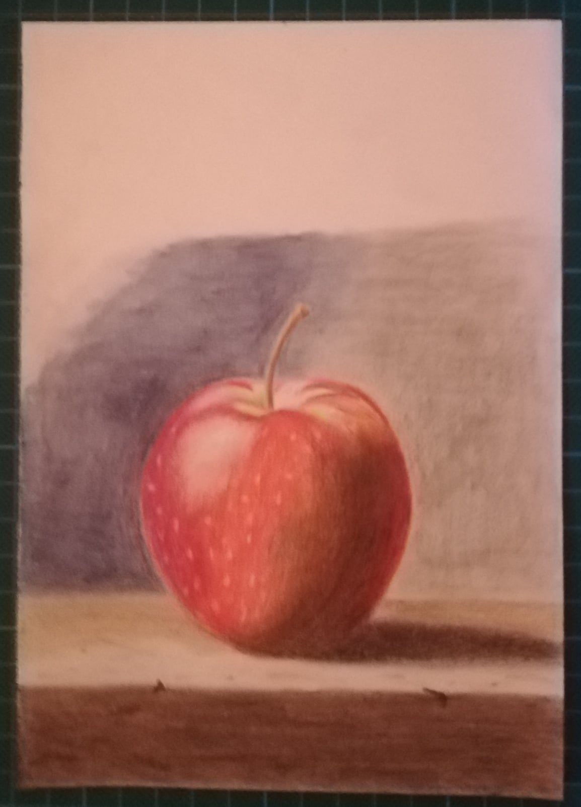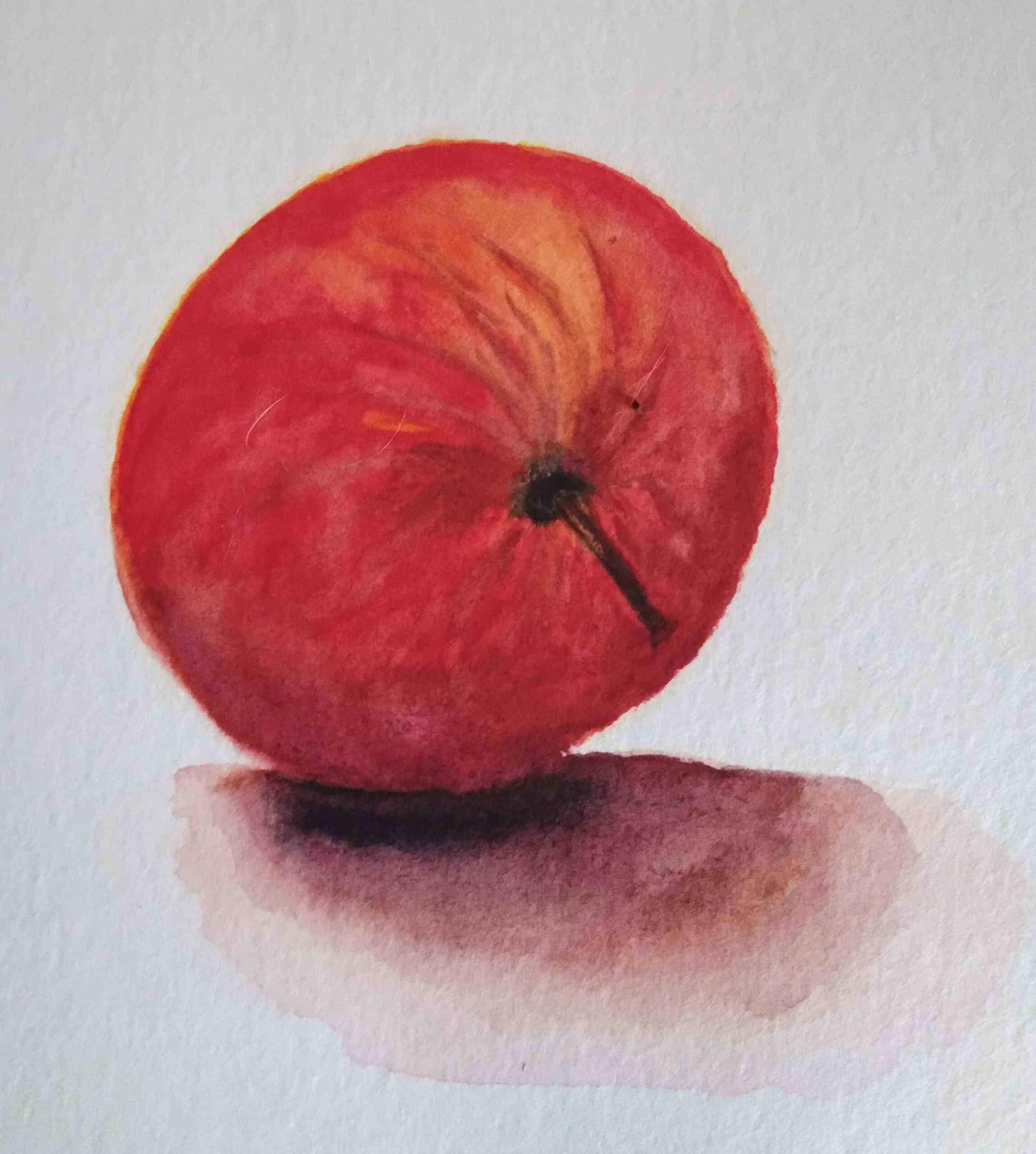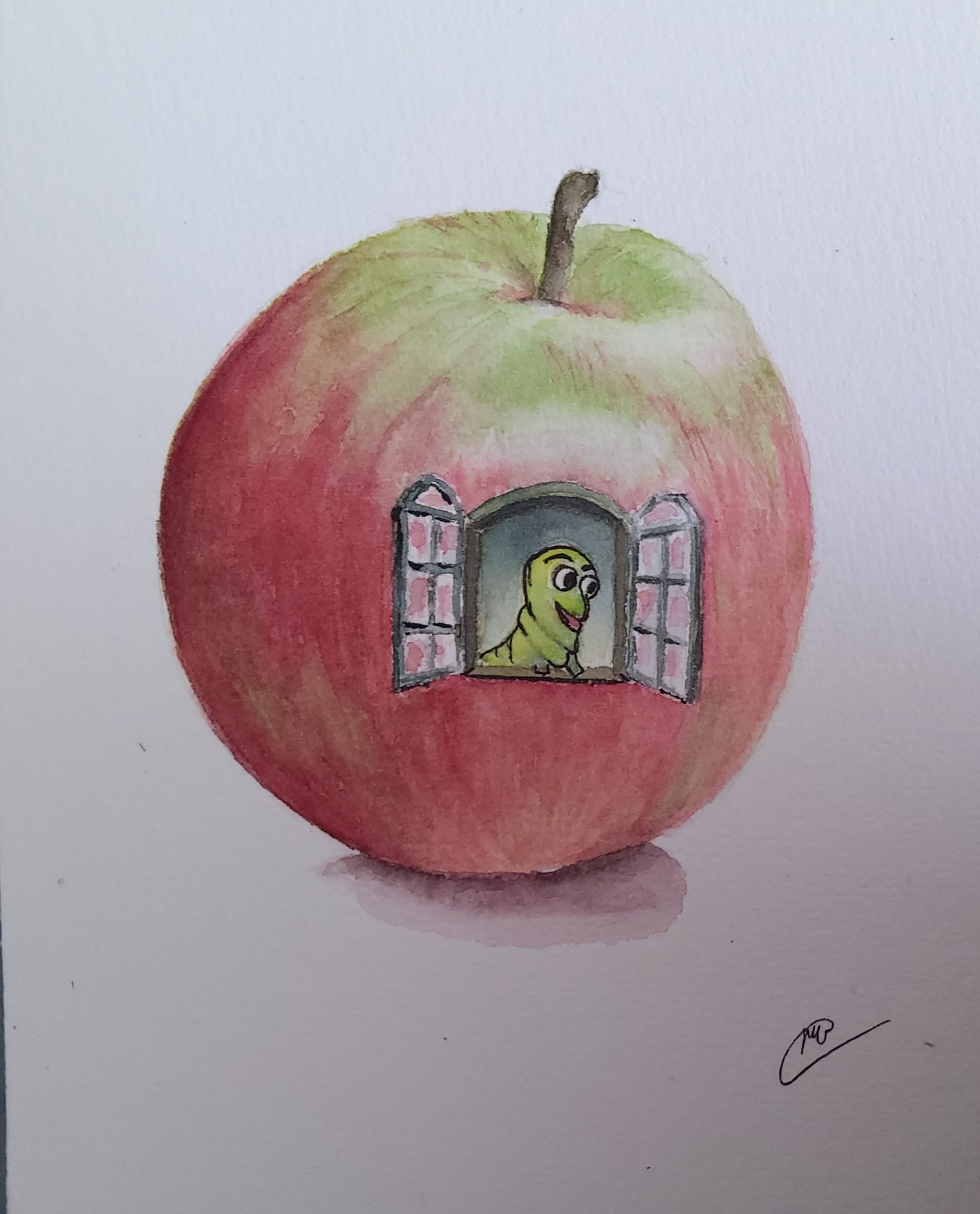 @Corinne18Bonjour, voici une pomme à l'aquarelle posée sur ma table avant que je la mange.