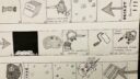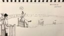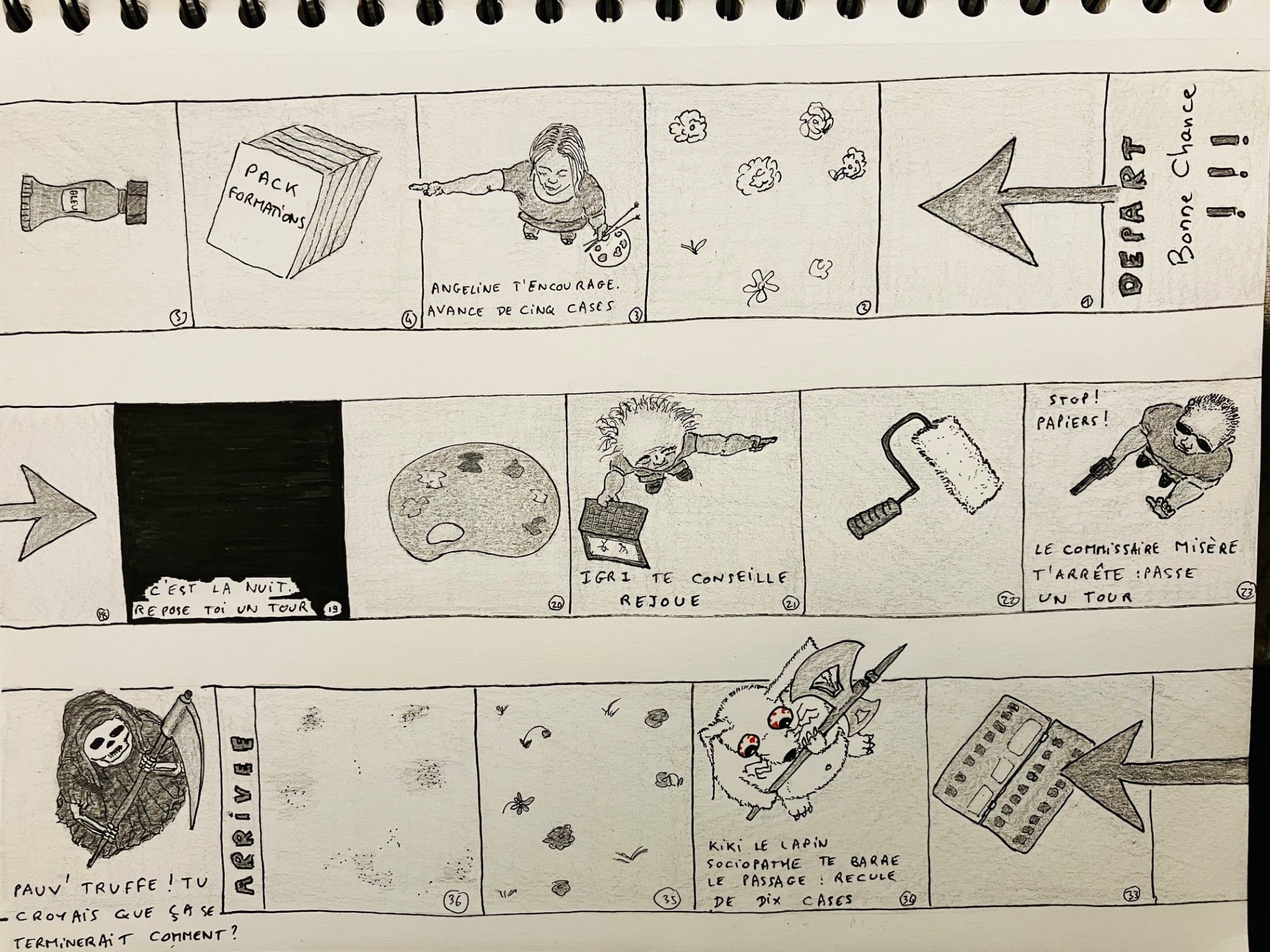 La boutique de tir, c'était pas facile : soit je représentais des dimensions normales – mais alors les personnages auraient été tout petits… et puis il fallait dessiner tout un environnement – soit je faisais un gros plan genre le tenancier, la mort et le temps ensemble – mais alors on ne voyait plus très bien la boutique, donc pas trop de lisibilité pour comprendre la case suivante. Finalement, j'ai fait un truc assez bizarre, avec un stand de tir tout resserré, une transition un peu brutale entre la zone éclairée et la zone nuit… mais ça fonctionne quand même parce que l'attention est surtout attirée par le gros bonhomme qui est un peu comme un trou noir, tout revient vers lui. Ce qui est marrant d'ailleurs, initialement c'était pas l'idée.