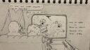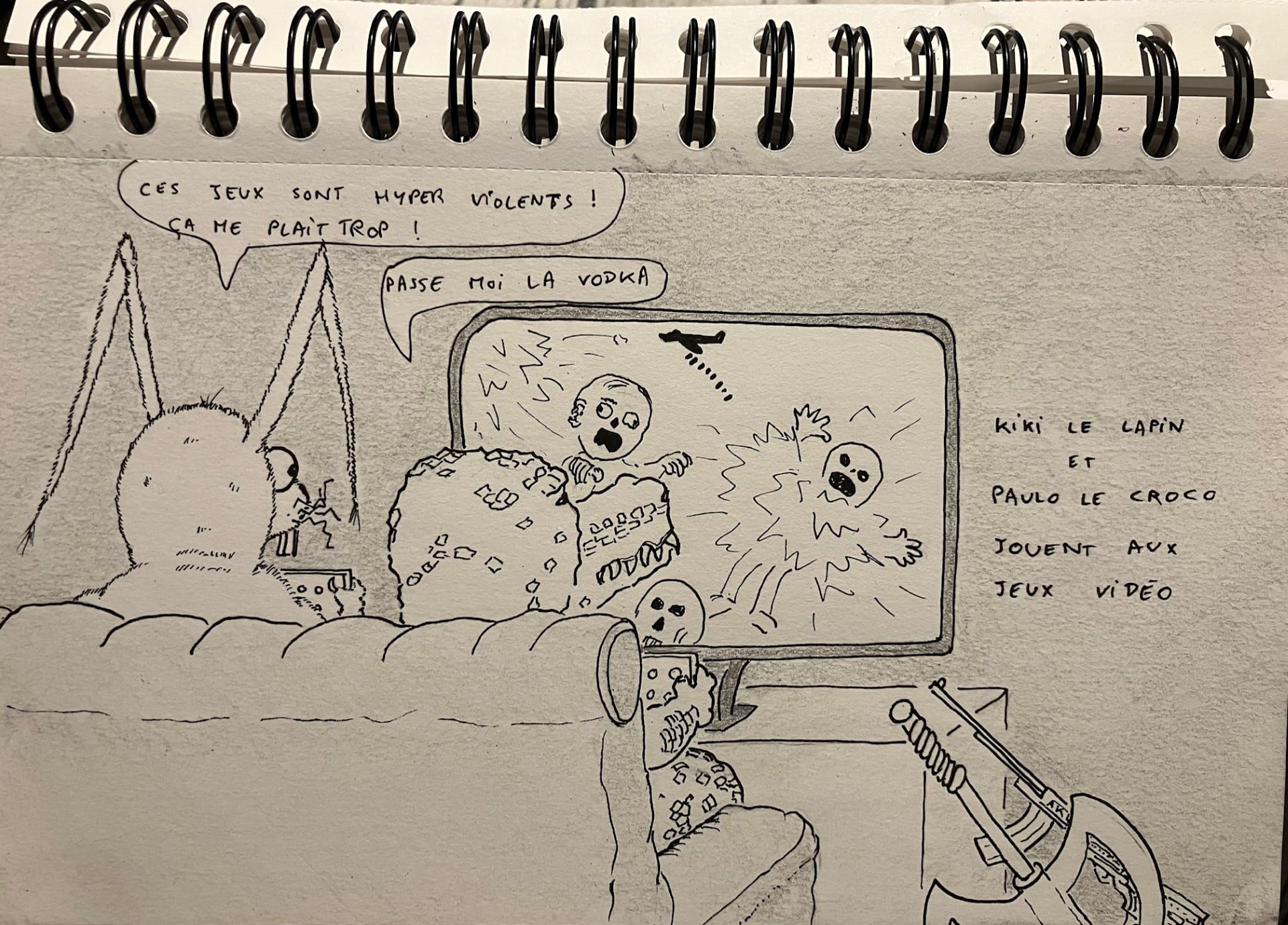 Sinon, une BD comme ça, bien sûr c'est marrant à faire. Mais ça donne pas mal envie de passer au numérique, parce que la couleur (ici aux crayons) c'est vachement de travail ; c'est un peu répétitif (crayonner doucement dans un sens, repasser dans l'autre sens…) ; et c'est pas très rigolo parce que l'essentiel de l'histoire est déjà dessiné à l'encre. On a envie que ça aille plus vite !