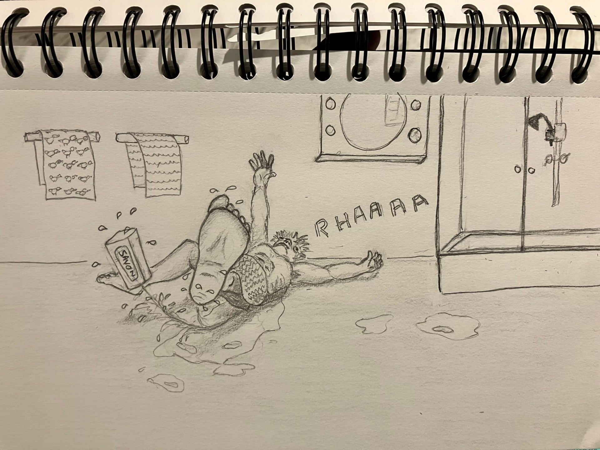 – pour “glisser”, j'ai essayé de (re)faire un truc auquel je m'était déjà attaqué, c'est à dire une vue en super-contre-plongée d'un gars qui dérape sur son savon. Mouais… il y a une marge de progrès.