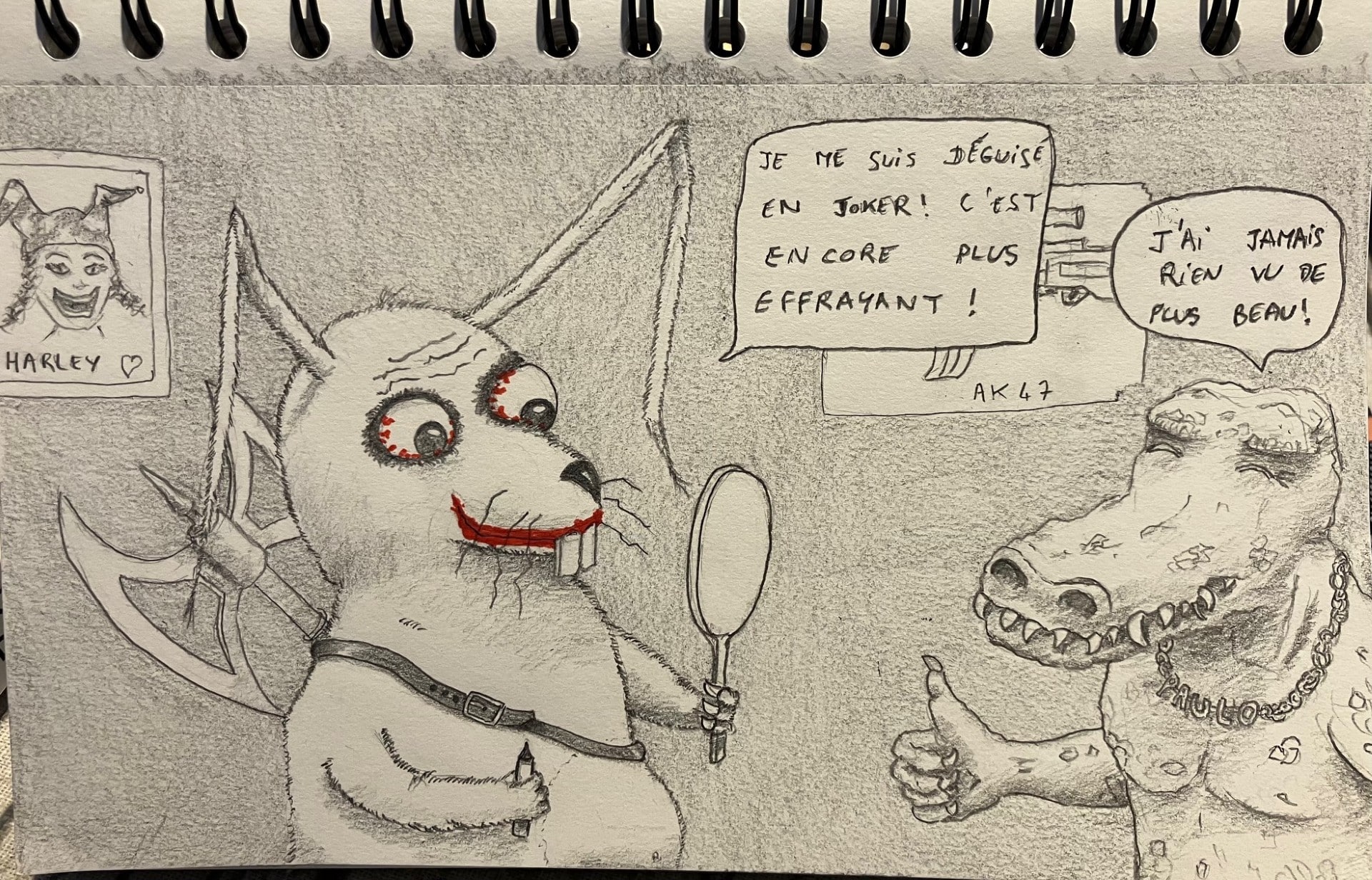 – Kiki qui se déguise en Joker pour Halloween. Ca devait être pour illustrer “villains”, il me semble.