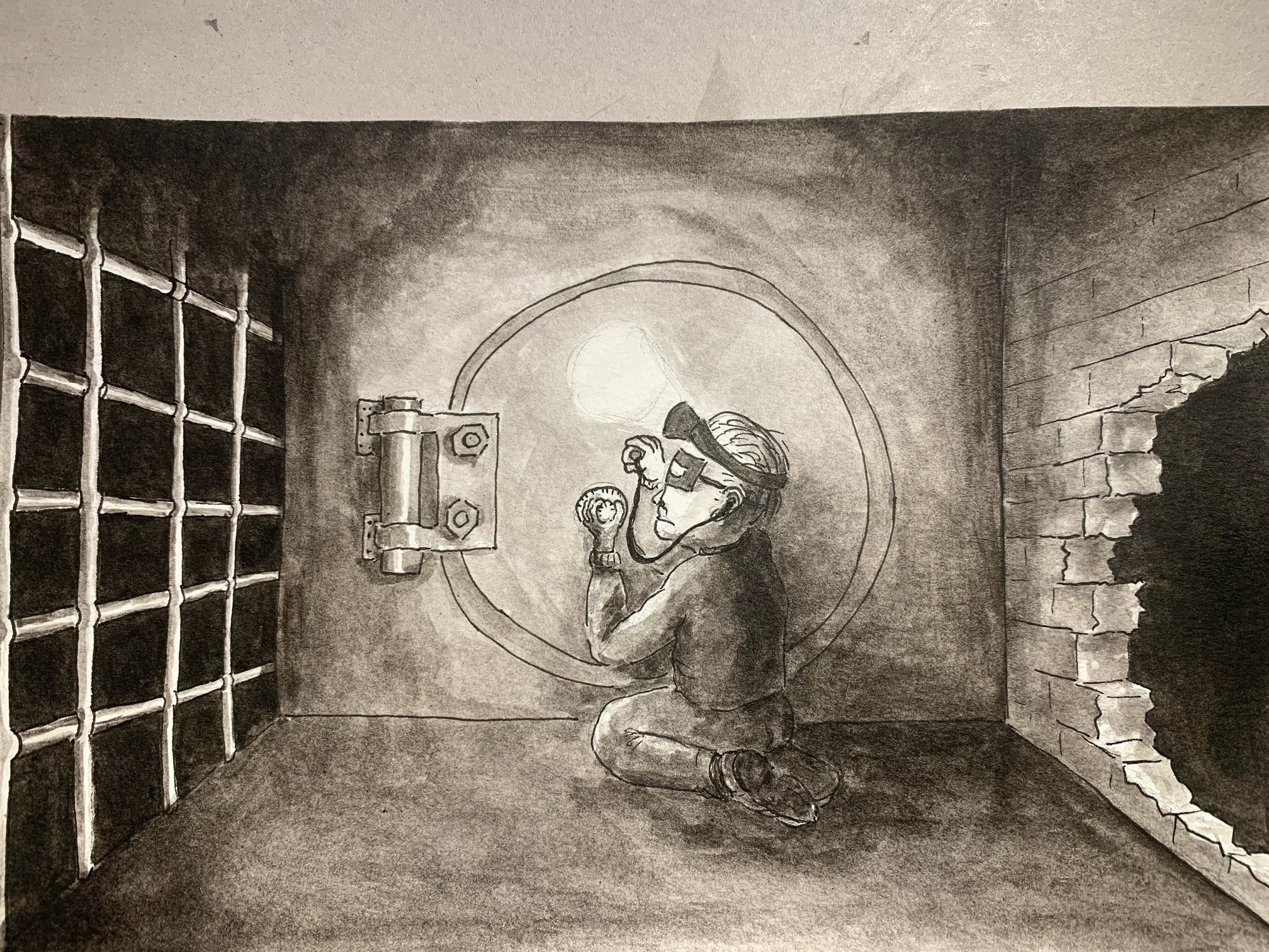 @chaise_de_jardinune fois mon dessin fini, voilà-t-y pas que je m'exclame : “mince alors, j'ai oublié de dessiner les morceaux de mur cassés, par terre” – parce qu'évidemment le gars est rentré dans la chambre forte en perçant le mur. On devrait voir des bouts de parpaings partout, et de la poussière.