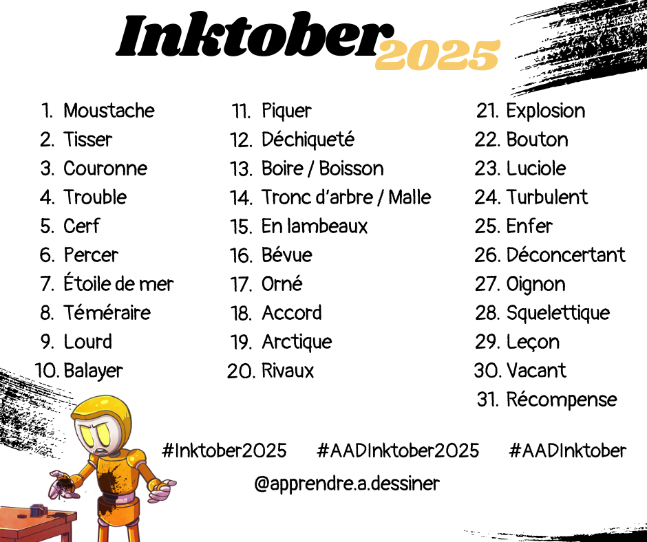 C'est le grand retour du mois d'octobre et avec lui, ton évènement préféré : l'Inktober ! Prépare tes carnets et tes outils, car la nouvelle liste de thèmes est là, prête à mettre ton imagination en ébullition.