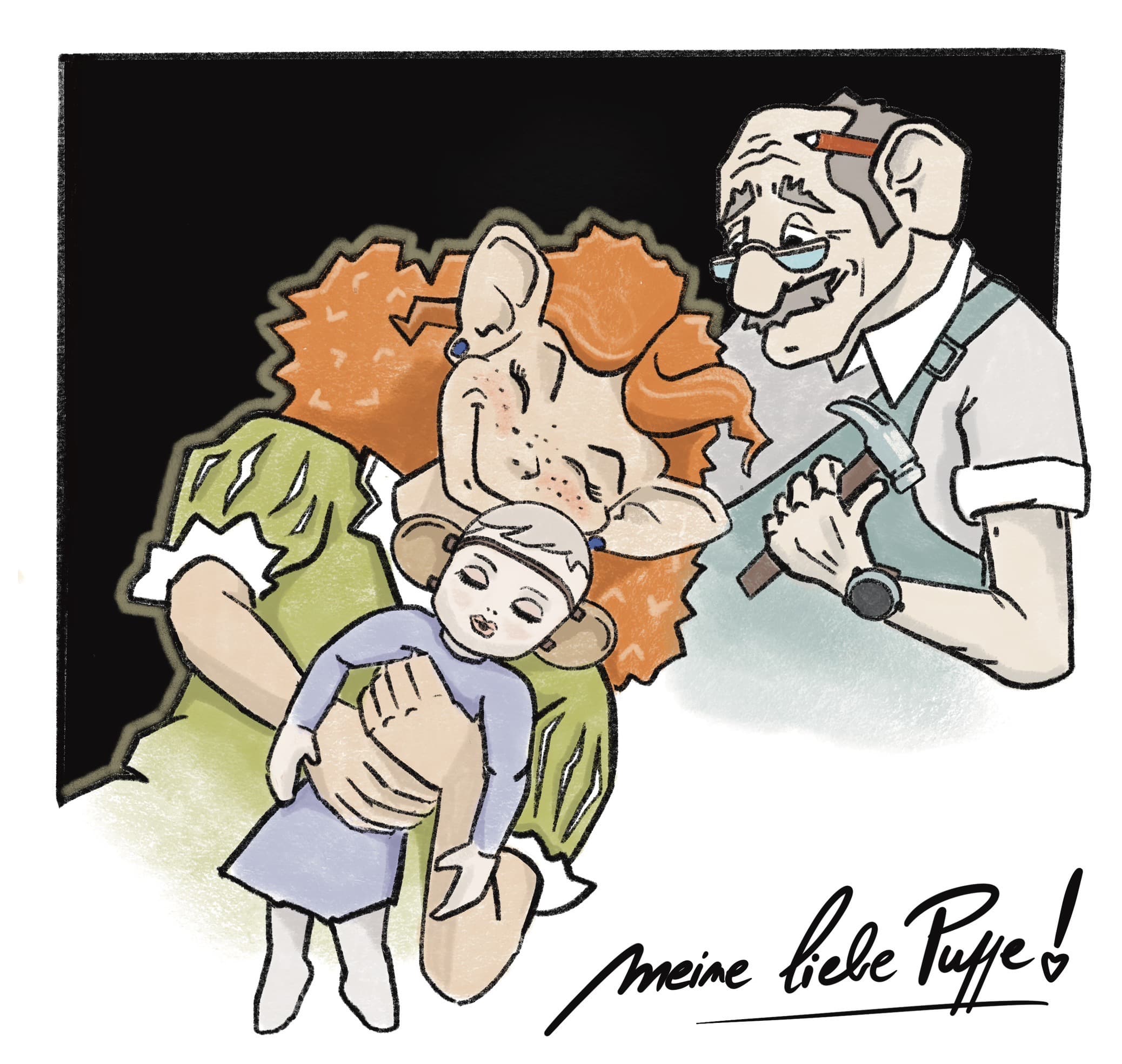 Voici aussi ma poupée. Quand j'étais petite, j'aimais bien tourner la tête des poupées de 180°, ça faisait bizarre. Voilà le rendu en dessin !