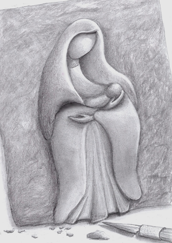 Et pour finir, la vierge. Comme le sujet ne m'inspirait vraiment pas, j'ai tenté de prendre du recul en m'imaginant la sculpter dans une plaque d'argile grise.
