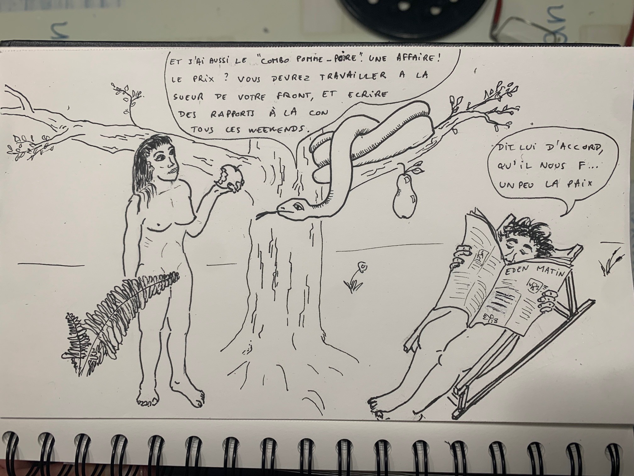 @Cedraak il y aurait peut-être un truc à trouver pour que le talon de la jeune personne donne bien l'impression de s'appuyer sur la jambe du gars. Peut-être en rajoutant des plis pour montrer que l'étoffe se déforme ?Pour ma part, en continuant sur l'idée des moules-frites et des jambon-beurres, j'ai développé un grand mythe fondateur qui explique l'origine d'un des problèmes actuels de la civilisation. Mais je n'ai pas la patience méticuleuse de @Natura, à la dixième feuille sur un arbre j'arrête et je vais faire autre chose…