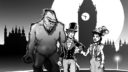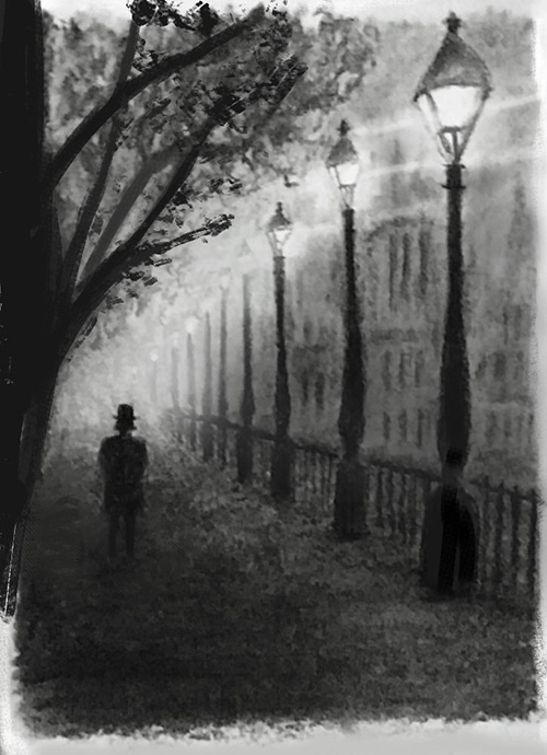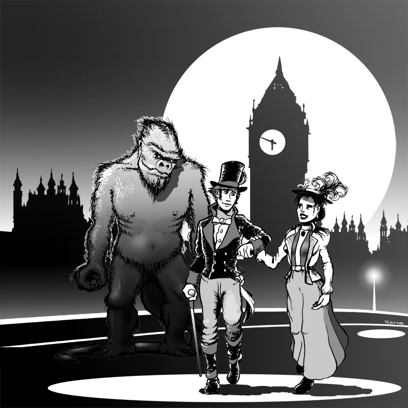 Scan et retour sous Toshop pour l'arrière plan de la ville londonienne (pompée honteusement depuis le Net), la Lune, les éclairages, le fog londonien, ombrages pour compléter la mise en volumes, et de “coloration” aussi.