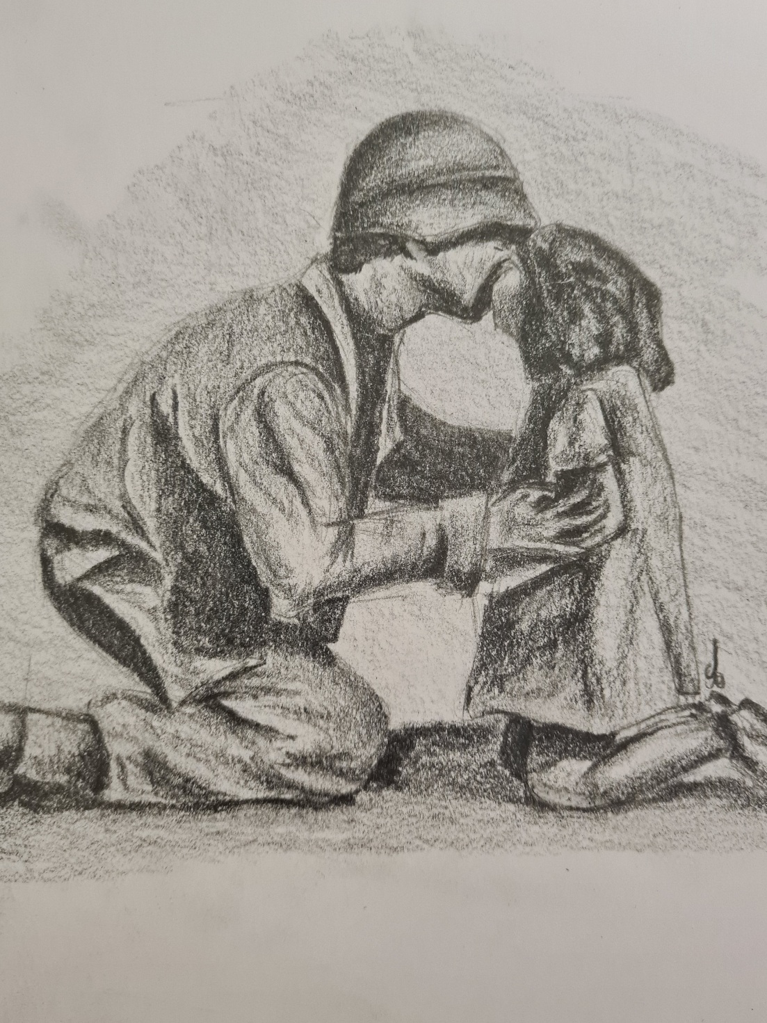 @Alfihar@OlivD L'idée est bonne, l'attitude des 2 personnages aussi. Ce qui dénote un peu, c'est la joue trop sombre du soldat, son nombre de doigts (peut-être en a-t'il perdu un au combat après tout) et l'épaule de la petite fille.