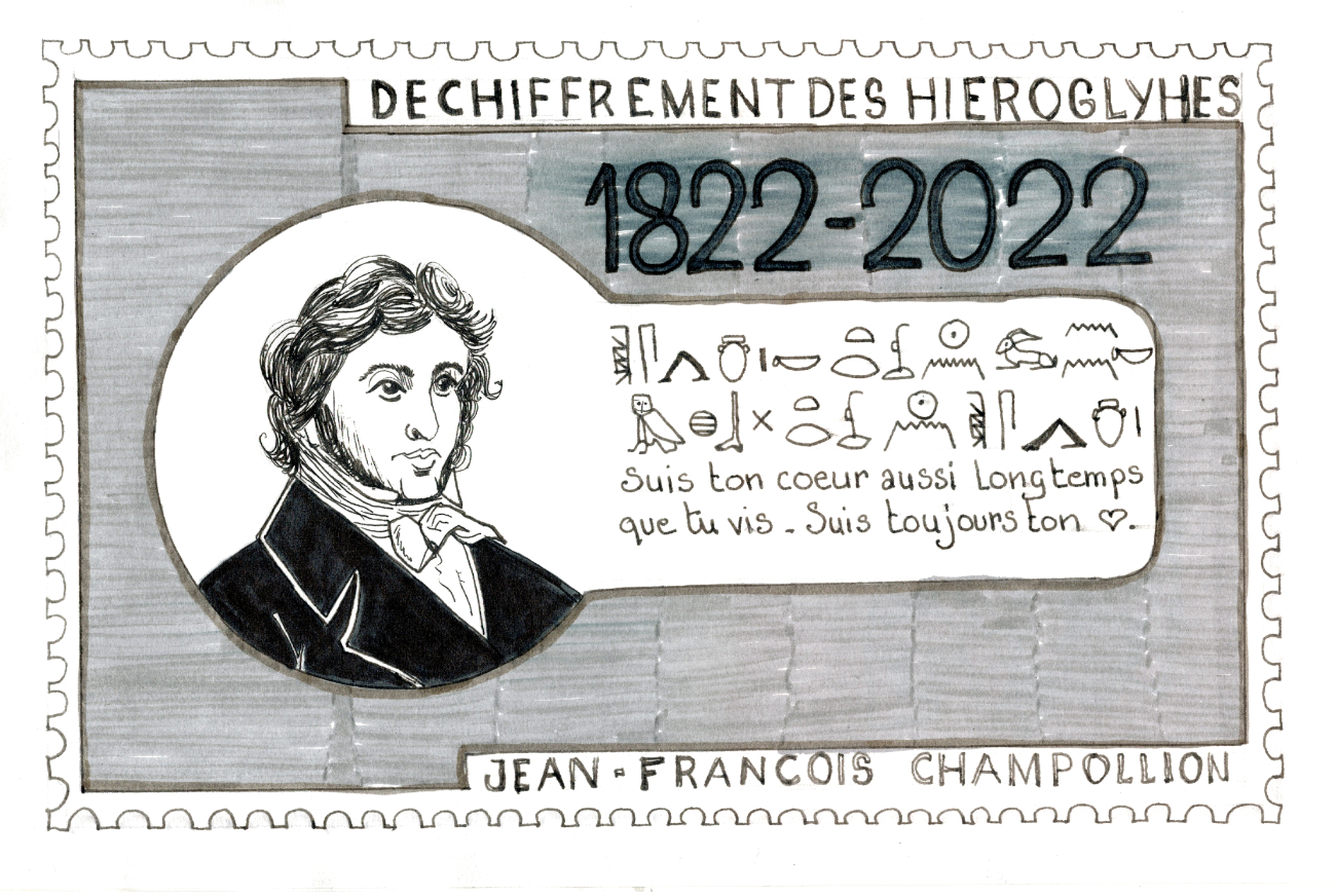 J'ai interprété déchiffrement /décryptage et cela m'a fait pensé à Notre Champollion national dont c'est le bicentenaire cette année de son décryptage des hiéroglyphes. Je lui ai donc consacré un timbre commémoratif.