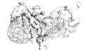 Au crayon : Je construis au minimum un “gros volume” pour placer l'ensemble sur ma page, et voir un peu comment le tout est orienté dans l'espace. Ensuite, je définis des volumes secondaires, j'indique ou non des idées de textures. Et je mets en évidence certains chevauchements (overlaps), pour m'assurer un peu de profondeur et penser à sauvegarder certaines zones pour le premier plan.A l'encre : Je commence un peu partout à faire des textures, à dessiner les volumes. J'évite de finir complétement une zone trop vite, afin pouvoir la modifier un peu ou complètement si l'envie m'en prend, ou si je veux ajouter un nouveau volume à l'avant, selon comment évolue tout le reste autour. Bref, je suis à peu près le plan de départ, mais avec la liberté de modifier selon mon envie tout ce qui est dans le “gros volume” ou, comme tu dis, quand des formes évoquent quelque chose d'intéressant. Et j'essaie aussi de faire une silhouette claire et avec des espaces négatifs.