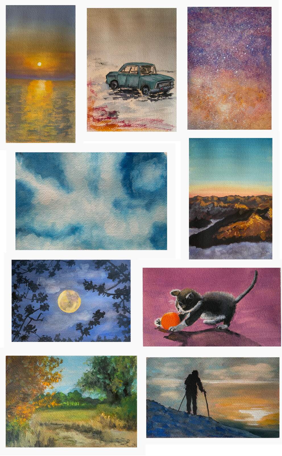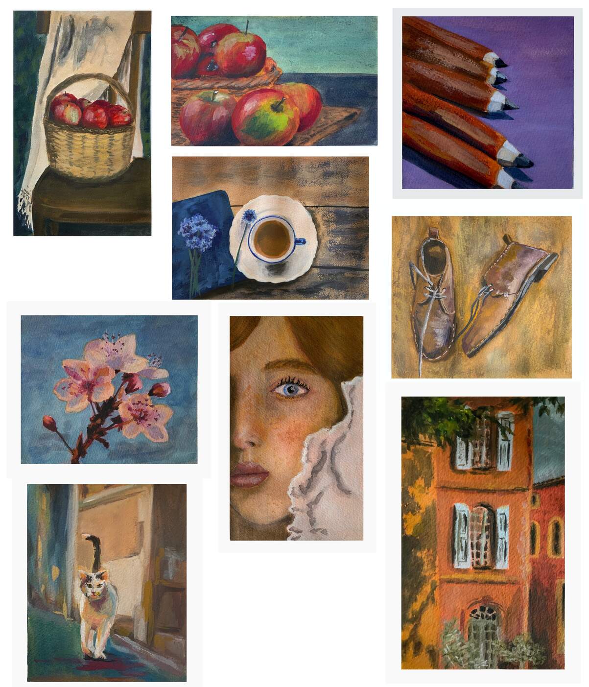 @Soeur_MarieÇa fait des lustres que je n’avais rien publié ici, voici mon travail sur l’ADDktoner de cette année, tout à la gouache, c’était le but de travailler ce médium. Mes préférés m le petit chat qui joue à la balle, le paysage, la paire de chaussures. Mais j’ai eu grand plaisir à les faire tous, même les moins réussis.
