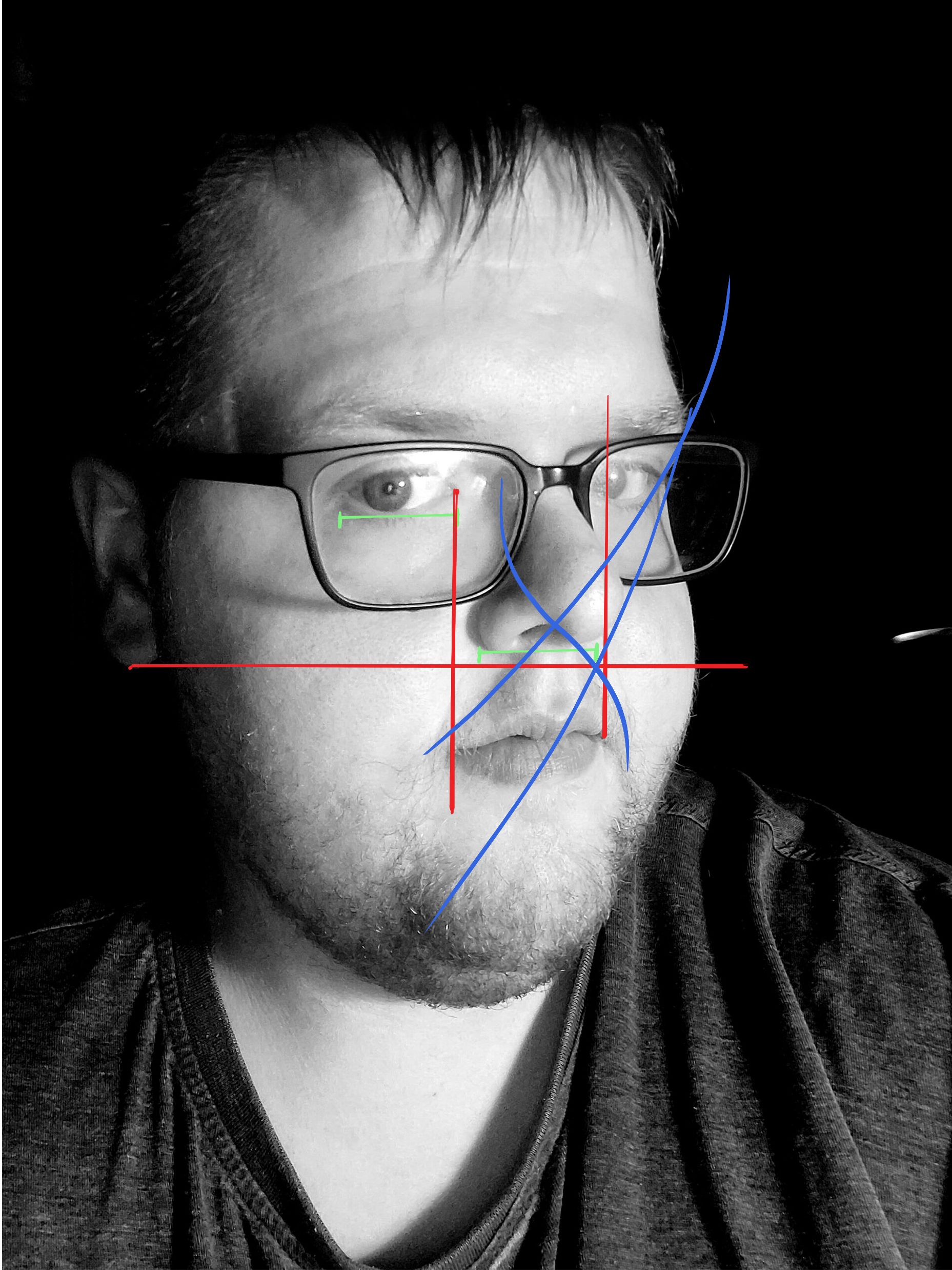 – reporter une unité de mesure pour controler. Par exemple, tu prends la largeur d'un oeil et tu compares, ici le base du nez est un peu plus grande que l'oeil à gauche sur la photo (donc l'oeil droit). En vert sur l'image.
