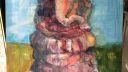 dans le cas qui nous intéresse, le genoux gauche est en pleine lumière, j'ai donc foncé un peu plus le ciel avec de l'outremer et le sol avec un rouge primaire sur le vert; le côté droit (à gauche sur le tableau) est légèrement à l'ombre, j'ai donc laissé le ciel et le sol plus clair …