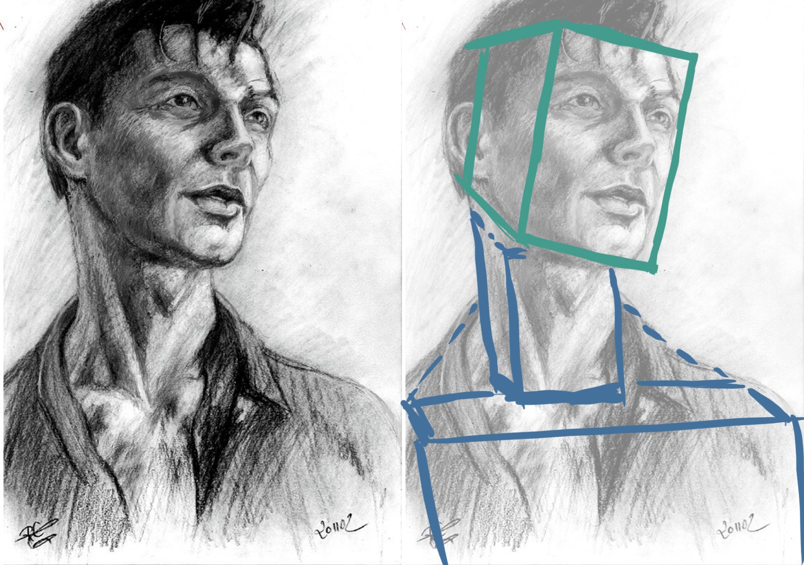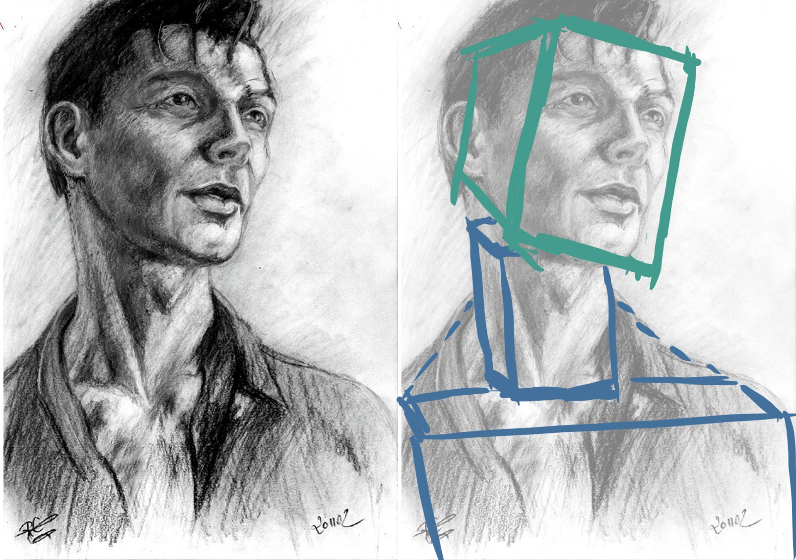 Il se peut que l'inclinaison de la tête ne soit pas à l'angle correct. Ensuite, j'interprète la manipulation d'un volume tel qu'elle devrait l'être en réalité. Si tu fait tourner un cube devant toi sans modifier l'inclinaison de ton regard ( donc la la LH à la hauteur des yeux, ça ne change pas les subdivisions du cube, elles seront indépendantes de la perspective de l'espace.) Il faut de plus ajuster le point de vue du cube, pour segmenter la tête encastrée en deux partie ( face et côté ) Pour un trois quart les faces du cube ne seront pas parallèles au plan de vision. Mais je crois que je complique les choses pour démystifier un portrait en légère contre-plongée. En tout cas , merci de te pencher ( sans jeu de mot malsain ) sur le problème