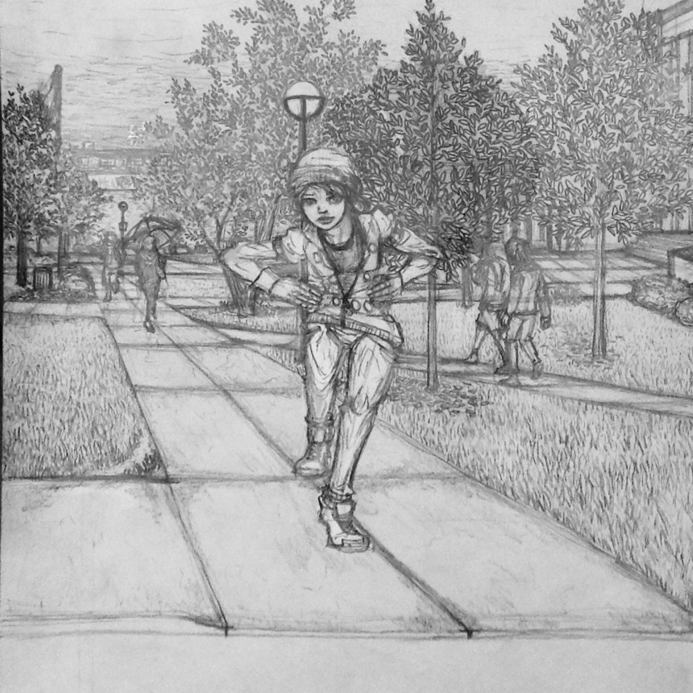 Avec ton dessin j'ai simplement modifié le ton général du ton sujet de premier plan, foncé un peu l'arbre et le lampadaire, et éclaircis un peu le fond.