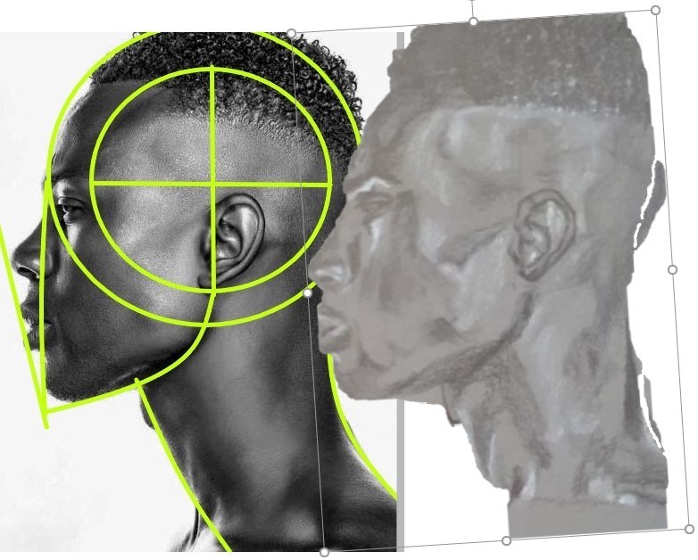 @Yassine_Benmezdad@aad-1566421398 (Té Té) : salut je peux critiquer un peu. Regarde les deux images j'ai été obligé de déformé ton dessin pour qu'il soit à peu près dans la même structure que la réf normalement je n'ai pas besoin de la déformé si la structure du portrait est bien construit je ne parle pas dur reste ombre …extra juste la structure il faut bien observé le portrait et prendre des repaires ce qui saute aux yeux l'alignement nez, bouche et montant cette ligne est plus incliné que dans ton dessin la référence que tu as choisi est très simple il faut appliquer les bases pour le reste C est pas mal il faut un début a tout peut être il faut rajouter plus de lumière et accentuer le noir la peau c'est la couleur de la feuille j'espère que tu as saisi.