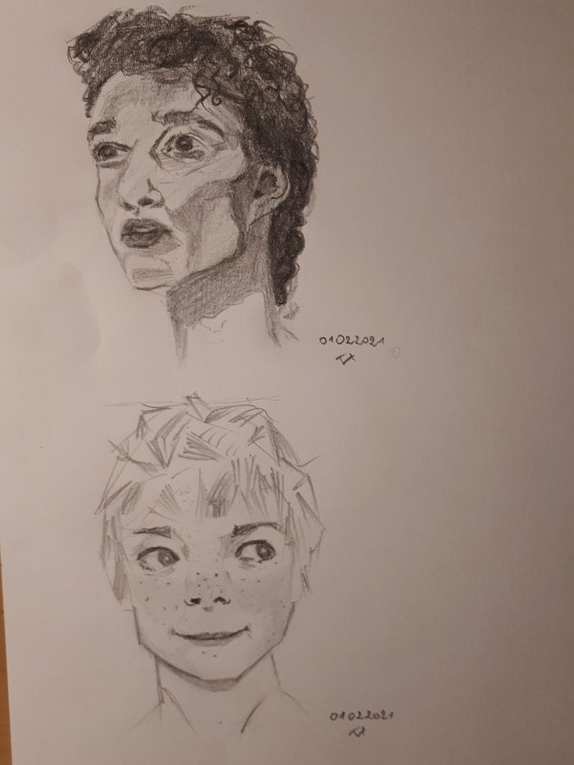 moi, j'ai fait trois portraits cet après-midi après avoir regardé la nouvelle vidéo de Pit sur la construction, et en essayant d'aller vite. Don c'est pas de la précision, mais je pense que je continue d'avancer un peu, je vois mieux les volumes et je gagne du temps.
