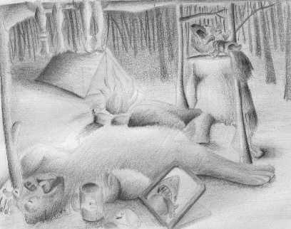 @Natura@aad-1457082431 (Bubulk) Pour ton histoire, je ne vois pas trop. Les ours ont pêché (des poissons sèchent suspendus) et campent… ils rigolent ou ils ont mal aux dents ? Avec plusieurs vignettes, on verrrait peut-être mieux.. Je voulais te remercier pour livrer les dessins qui te permettent de construire une scène, on voit bien comment tu t'y prends et que tu tiens vraiment compte de la perspective. Tu as aussi tenu compte de la lumière du feu, c'est intéressant.