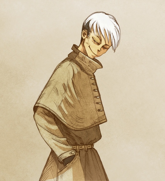 Quant à l’inspiration, je suis allée voir des images de films/anims/bandes dessinées. Pour Paul, je suis allée chercher des images de Sean Connery dans le « Nom de la rose » (pour l’habit de moine et l’attitude) et les dessins de Bourgeon (les compagnons du crépuscule), pour « le dix-septième », je suis allée piocher dans la série animée « baccano !», pour l’idiot, je suis allée voir du côté d’« elephant man », pour les absents, j’ai tout de suite pensé aux créatures visqueuses des dessins animés de Miyazaki et aux masques vénitiens, pour Gilles, à un personnage typique de manga, mais que je n’ai pas retrouvé au final. Pour les autres, je ne me souviens plus très bien. Sûrement plein d’images, mais aucune en particulier. Les inspirations sont moins évidentes.