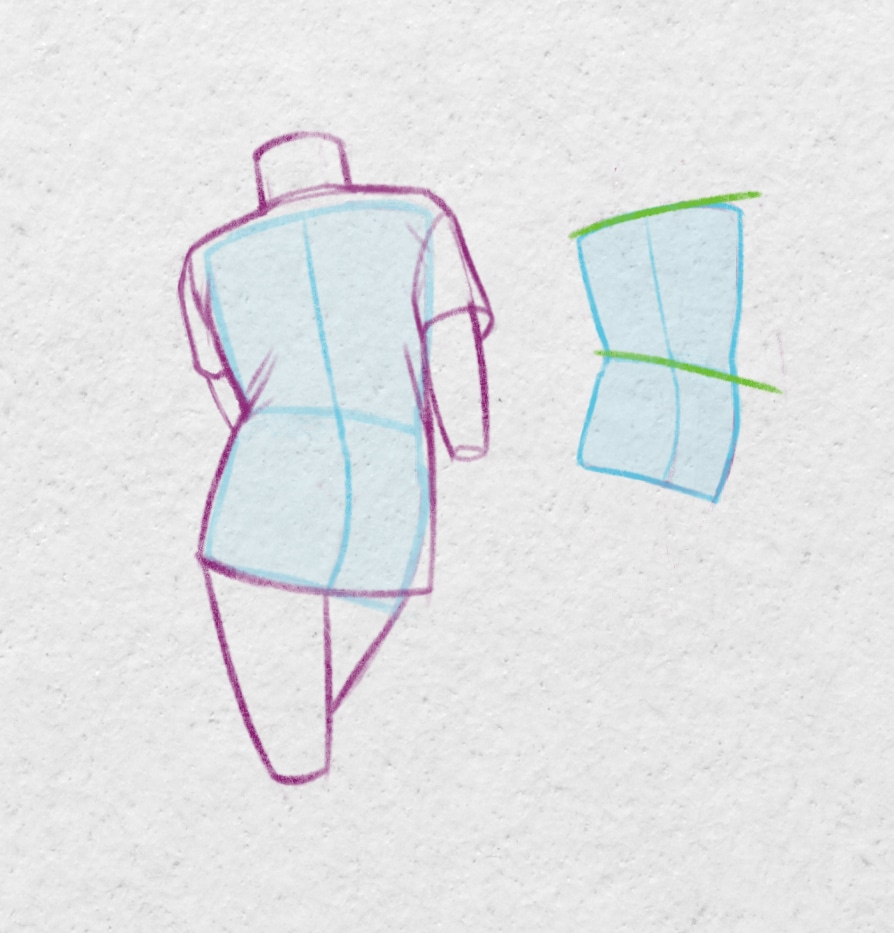 La colonne vertébrale forme quasiment un “S” en vue de profil, par conséquent pour marquer un dos cambré pour la vue de dos, il faudra accentuer cette forme de “S” . Dessinez une forme de sablier et jouez sur les ombres ou encore les plis des vêtements au niveau de la taille, pour bien marquer la cambrure du personnage.