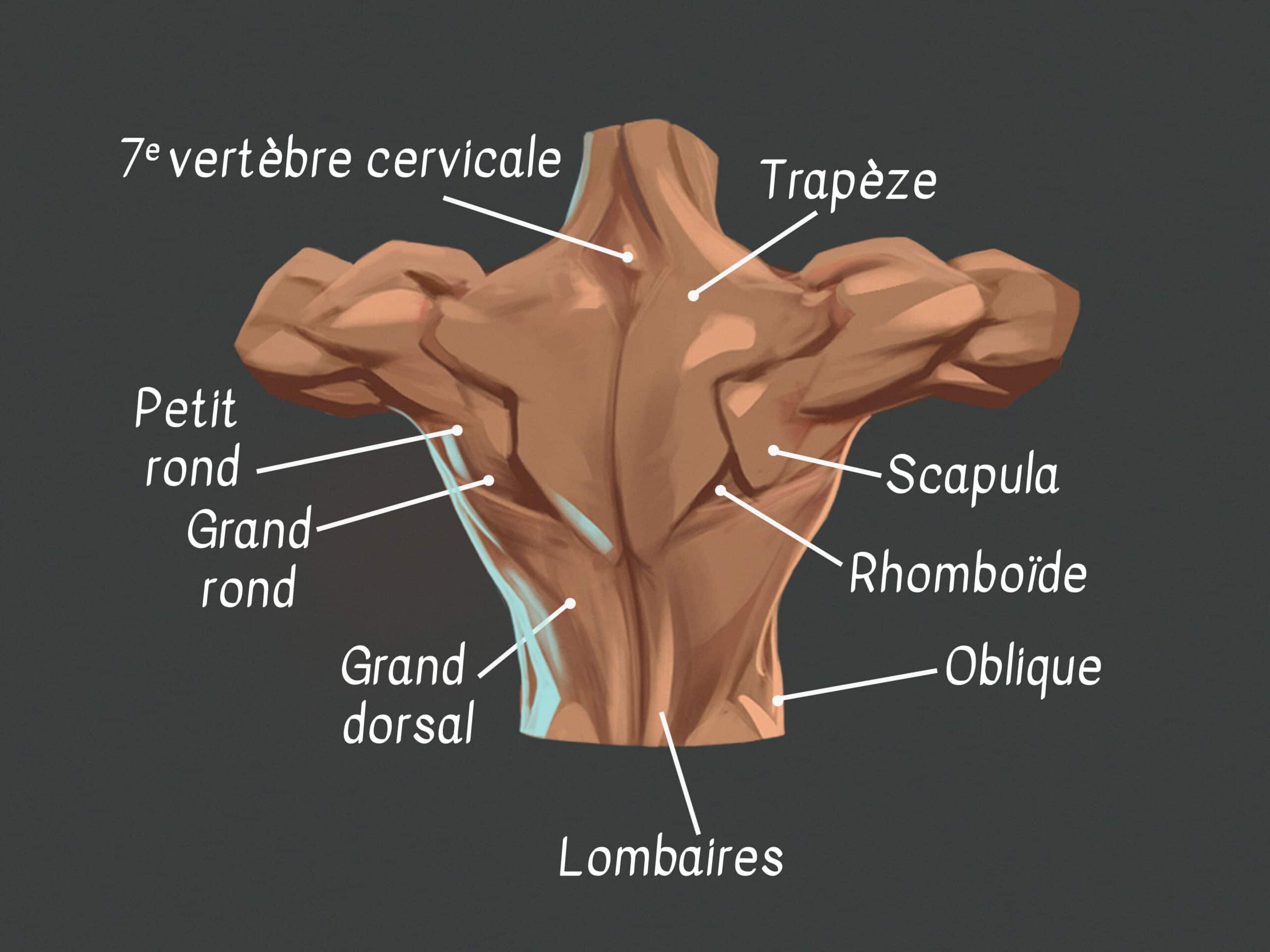 Dans un premier temps nous allons voir les principaux muscles et os du dos pour comprendre le volume et les formes de ceux-ci. Toutefois, il n’est pas nécessaire de connaître parfaitement l’anatomie du dos pour dessiner des personnages bien structurés.